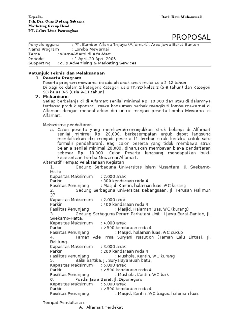 Sehubungan dengan akan diadakannya acara Lomba Mewarnai tingkat PAUDTK Lomba Menggambar dan Mewarnai tingkat SD kelas 4-6 Lomba Berpuisi tingkat SD Kelas 4-6 dan Fashion Show tingkat TK dan SD maka dengan ini Emotion Education Center EMODO menawarkan kerjasama dalam acara lomba tersebut diatas. Peserta KegiatanPeserta kegiatan ini adalah anak usia pra sekolah TK RA PAUD di Kabupaten Cilacap. Contoh Proposal Lomba Mewarnai PROPOSAL KEGIATAN.