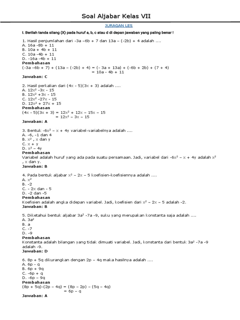 Contoh Soal Aljabar Kelas 7 Smp Plus Jawaban Dan Pembahasan Juragan Les