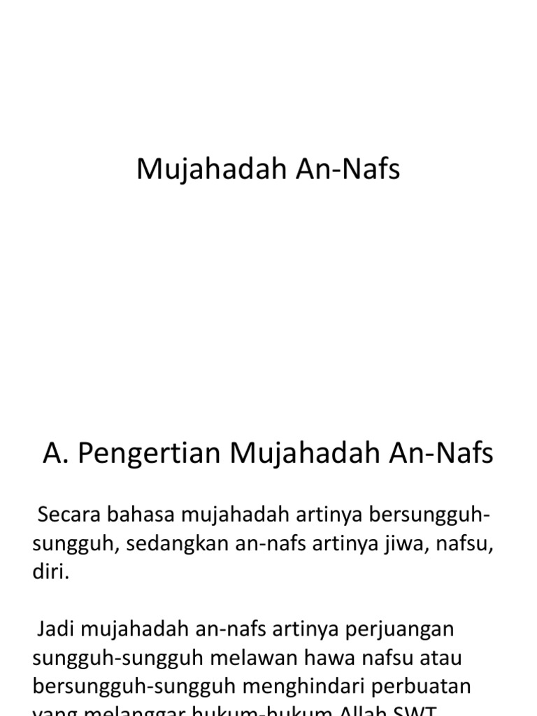 Mujahadatun Nafs atau dalam bahasa Indonesia berarti kontrol diri yang dapat dimaknai sebagai berjihad melawan hawa nafsu adalah perbuatan menjauhi segala hal yang dilarang dalam agama Islam. Mujahadah An Nafs. 2 Bersabar dengan tidak membalas terhadap ejekan.