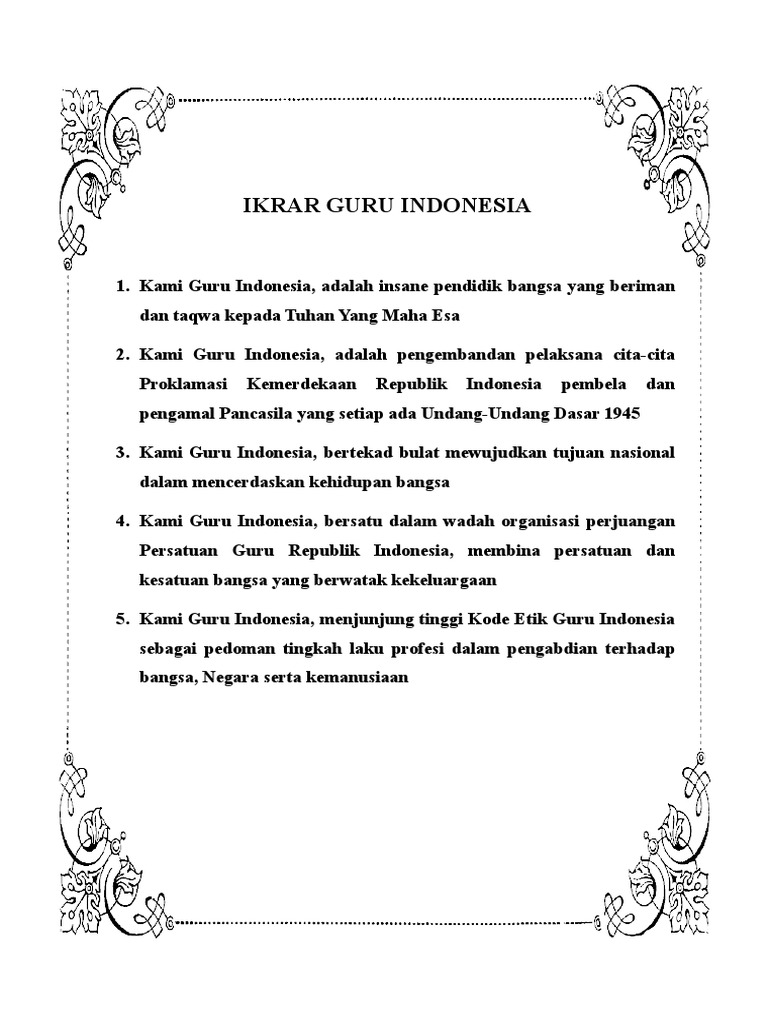 Ikrar guru indonesia pdf. Kami guru Indonesia adalah pengemban dan pelaksana cita-cita proklamasi kemerdekaan Republik Indonesia pembela dan pengamal Pancasila yang setia pada Undang-Undang Dasar 1945. Tata tertib guru 4. Ikrar Guru Indonesia Kami Guru Indonesia adalah insan pendidik bangsa yang beriman dan bertaqwa kepada Tuhan Yang Maha Esa Kami Guru Indonesia adalah pengemban dan pelaksana cita- cita dan Proklamasi Kemerdekaan Republik Indonesia pembela dan pengamal Pancasila yang setia pada UUD45 Kami Guru Indonesia bertekad bulat mewujudkan tujuan.