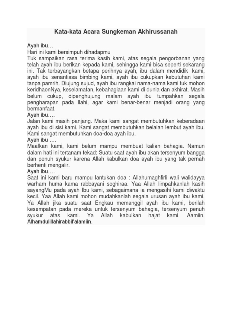 SOAL UJIAN SEMESTER KELAS XI. Contoh Sungkeman Pernihakan Bahasa Indonesia Kepada Ibu Kandung Ibu ijinkan kami kali ini tuk bersimpuh di pangkuanmu tuk sekali lagi merasakan kasihsayangmu tuk melebur kesalahan yang pernah kami lakukan kepadamu untuk kembali memohon doa dan restumu. Dengan kata-kata perpisahan sekolah kekhawatiranmu untuk berpisah dengan sahabat akan berkurang.