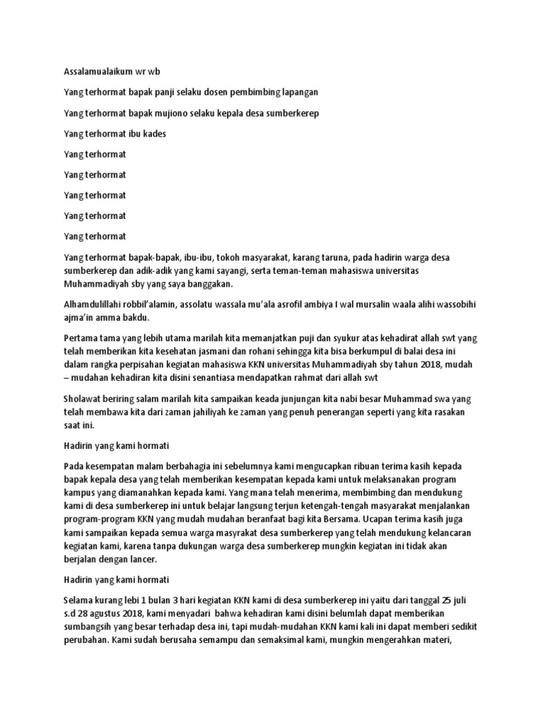 Yang terhormat ibu kepala desa desa. Contoh Sambutan Perpisahan KKN. Pada kesempatan yang berbahagia ini izinkanlah saya mewakili rekan-rekan Mahasiswa KKN UMP 2012 di Desa Somorejo untuk menyampaikan sepatah dua patah kata sebagai salam perpisahan dari kami mahasiswa KKN UMP 2012 di Desa Somorejo tercinta ini.